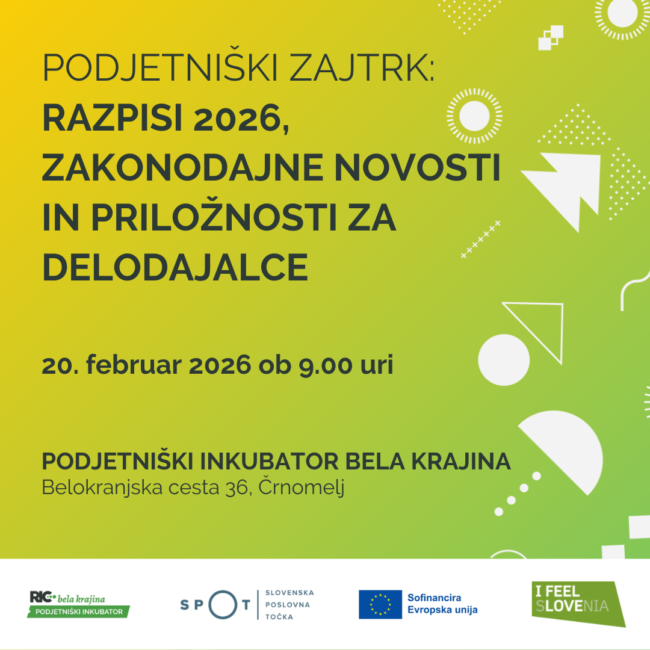 Podjetniški zajtrk: Razpisi 2026, zakonodajne novosti in priložnosti za delodajalce 📅 KDAJ: 20. februar 2026, od 9.00 do 10.30. 📍LOKACIJA: Podjetniški inkubator Bela krajina, Belokranjska cesta 36,  8340 Črnomelj.   PRIJAVA NA DOGODEK TUKAJ: PRIJAVA SPOT Svetovanje JV Slovenija vas vljudno vabi na informativno-mreženjski dogodek »Podjetniški zajtrk: Razpisi 2026, zakonodajne novosti in priložnosti za delodajalce«,…